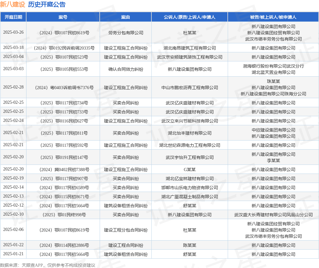 本站消息,根据天眼查APP显示,近日公布了一则新八建设集团有限公司作为被告/被上诉人的开庭公告,详细内容如下: